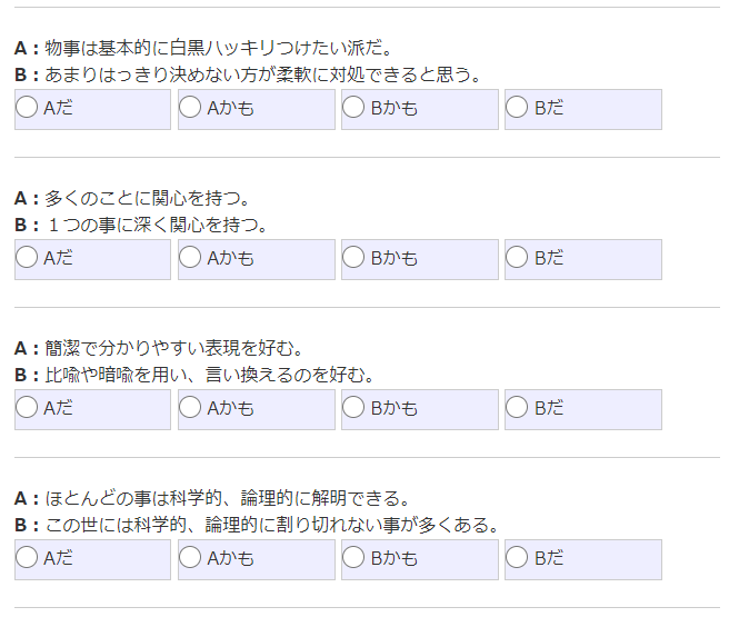 診断方法はとても簡単で、与えられたAとBの考えに近い方を選んでいくだけ。