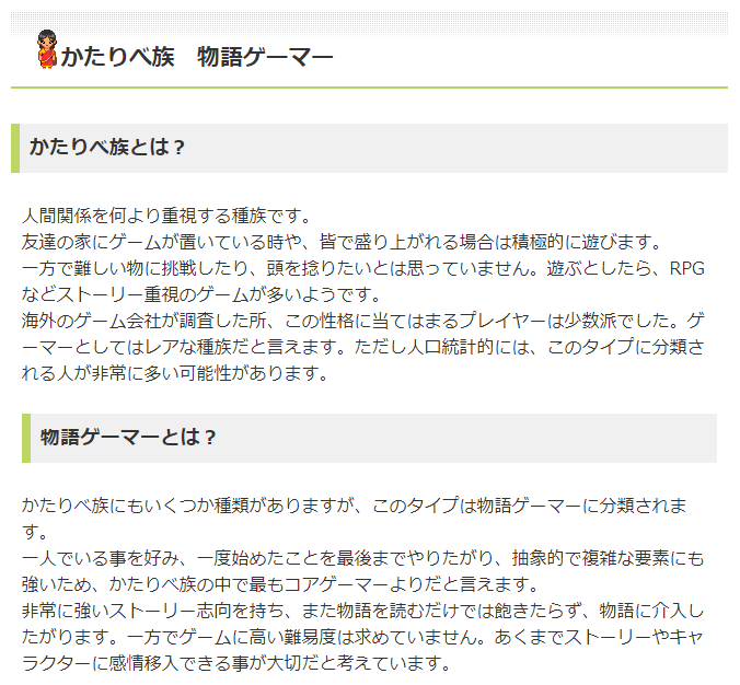 そして得られた診断結果が、「かたりべ族 物語ゲーマー」というものでした。